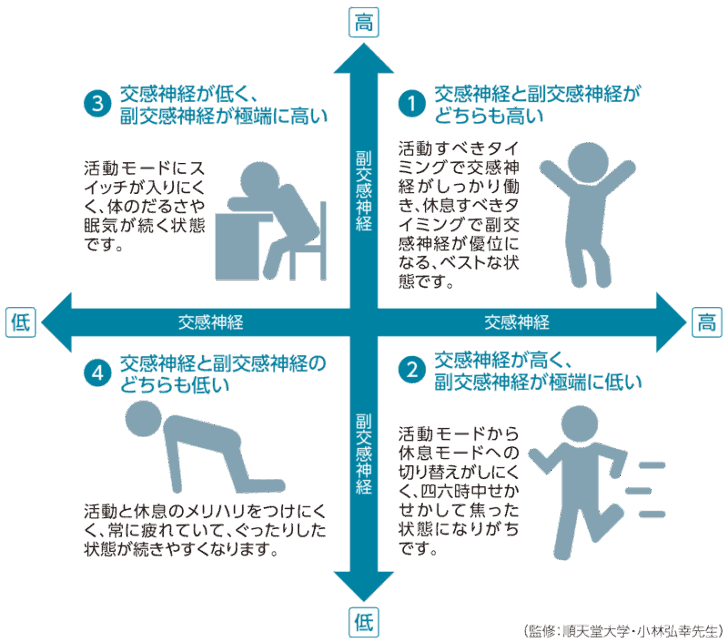この2つがシーソーのようにバランスを取ることで、心身は快調に働きます。しかし、どちらかに偏ると疲れ、眠れない、胃腸不良、肩こり、メンタル不調などが起きやすくなります。