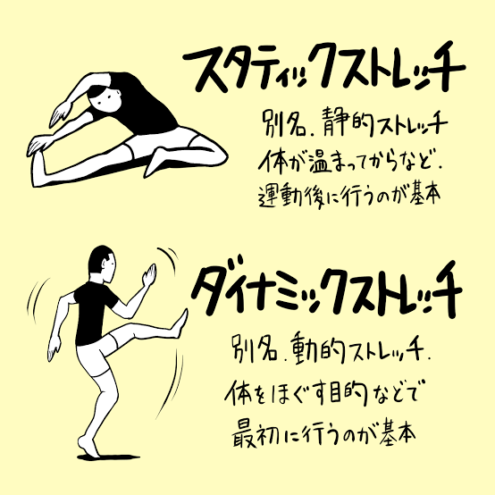 ダイナミックストレッチ、バリスティックストレッチは動的ストレッチと言い、反動や動きを使って行うストレッチなので運動前に行うと効果があります!