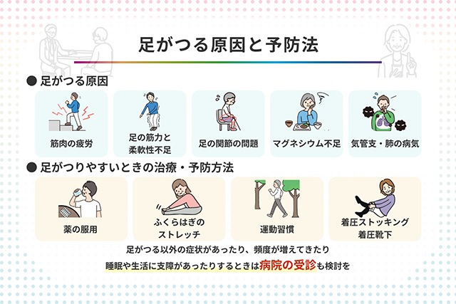 – 頻繁にこむら返りが起こる場合は、隠れた疾患がないか医師に相談する。