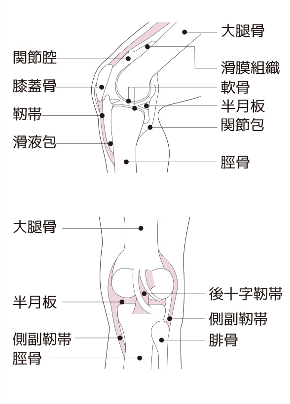 膝の関節は、太ももの大腿骨と脚のすねにある脛骨(けいこつ)、一般的に「膝の皿」と呼ばれている膝蓋骨(しつがいこつ)で構成されており、脛骨を支えている腓骨(ひこつ)を含め、その周囲は関節包(かんせつほう)という袋に包まれています。骨と骨の接合部分が浅いため、不安定になりがちですが、周囲にある筋肉や腱、靭帯などが関節の安定性を保つ役割を果たしています。